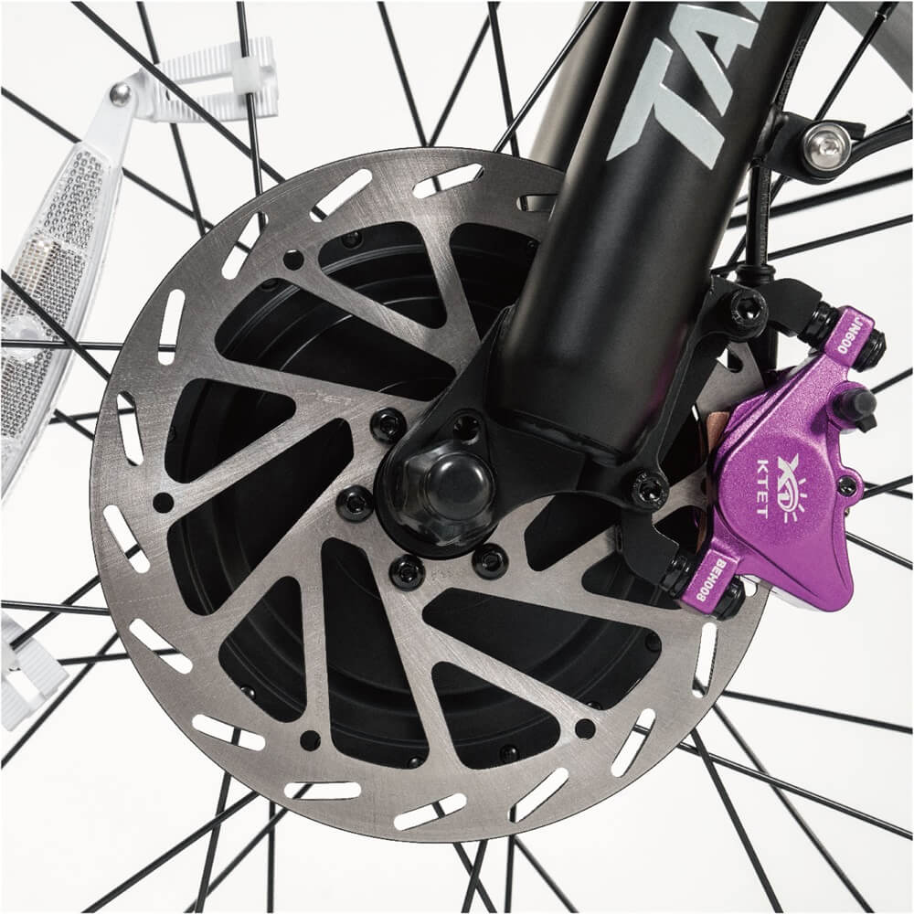 Professional hydraulic disc brakes offer reliable, responsive braking in wet weather, steep descents, and busy city traffic.